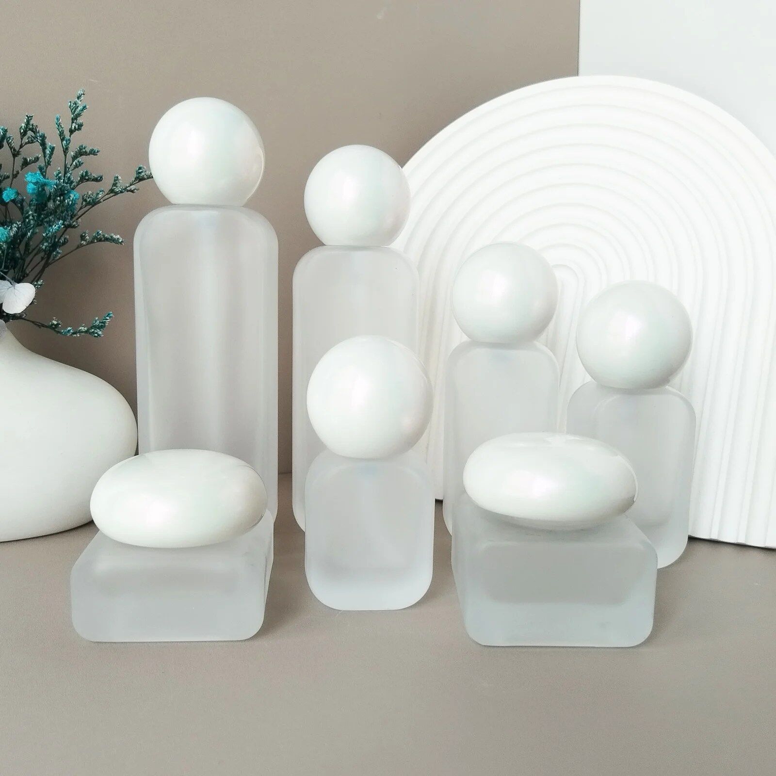– Cream Jars: Come with elegant spherical lids that lock tightly, keeping creams, balms, and masks free from contamination and maintaining texture.